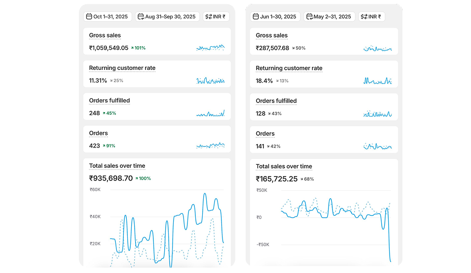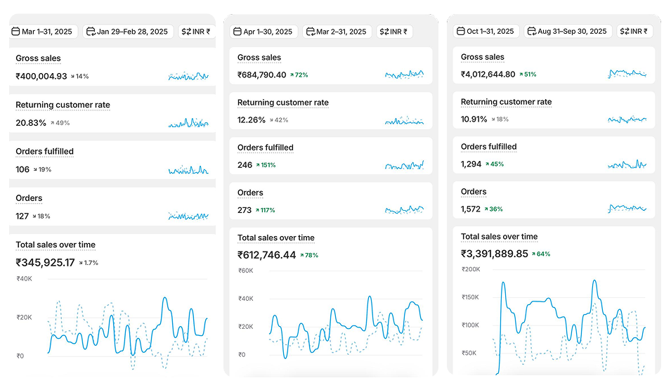 From ₹4L in March → ₹17L+ in May → ₹30L+ by October, with strong repeat customers and a healthy ROI.